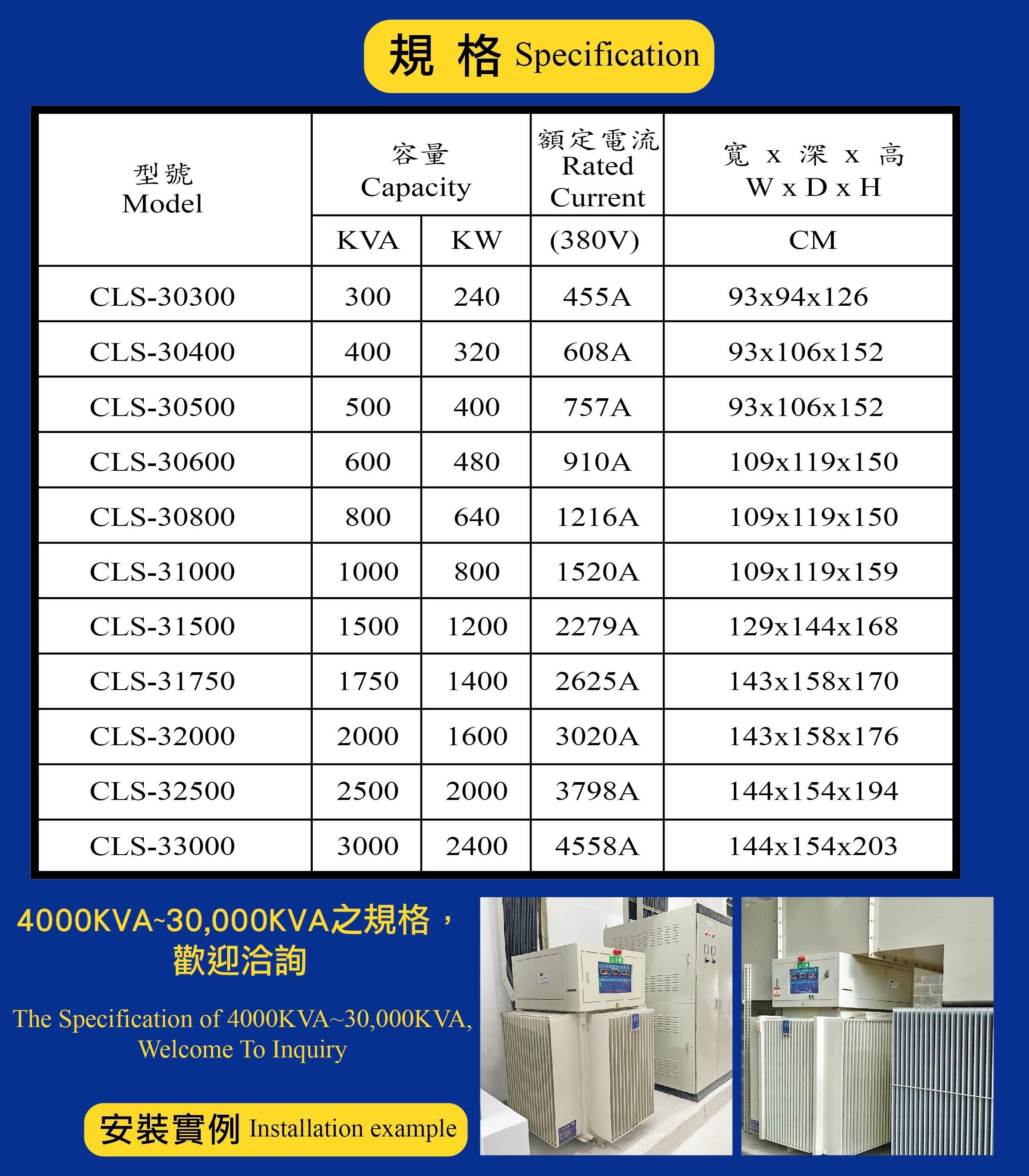 感應式是唯一單機可做超大型容量之穩壓器,可生產30,000KVA以上機型。